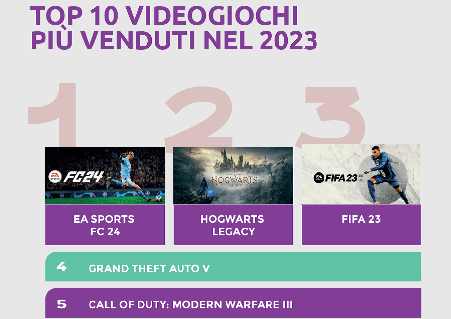 A sancire l'attendibilità di questi dati, ci pensa la Top Ten dei videogiochi più venduti nel 2023: ai primi posti l'incontrastato gioco sportivo per eccellenza EA SPORTS FC 24 (almeno finché l'online non prenderà piede con il suo avversario più ostico, ovvero EFootball), con Hogwarts Legacy amato dagli hardcore gamer a digiuno di open world di un certo livello.